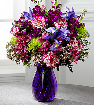 Blooming with rich color and undeniable texture, this stunning bouquet expresses love and gratitude with each perfect flower. Blue Iris, fragrant purple gilly flower, purple Peruvian Lilies, purple bi-color carnations, green spider chrysanthemums, clusters of pink wax flower, and lush greens create a fascinating display presented in a deep purple glass vase with modern lines to create a sophisticated look.