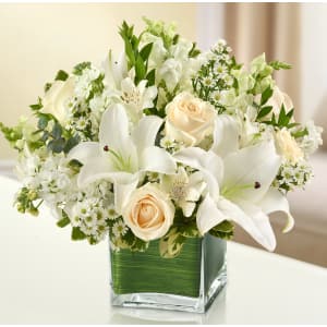 This all-white arrangement of roses, lilies, snapdragons, monte casino, stock and alstroemeria is accented with variegated pittosporum, myrtle and spiral eucalyptus and artistically designed by our florists in a classic glass cube vase lined with a Ti leaf ribbon.