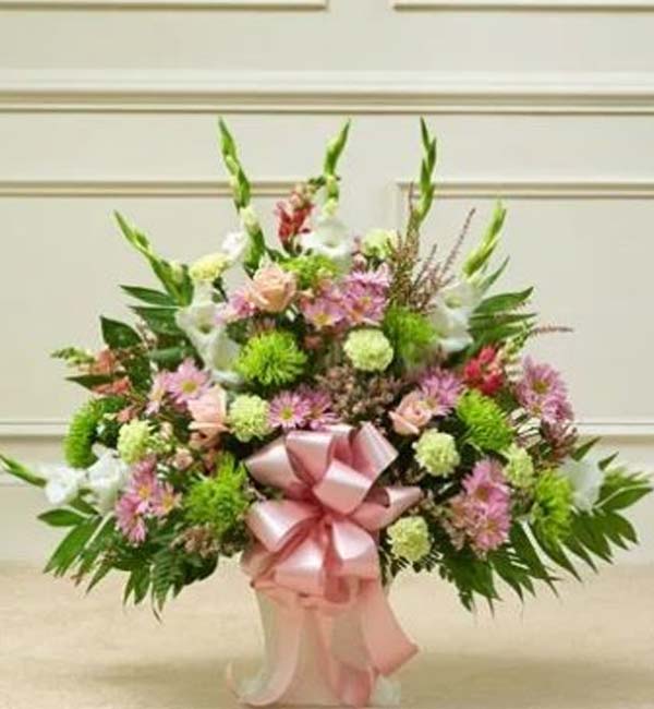 When you’re trying to find a way to express your deepest sympathy, this pastel floor basket helps you beautifully say what is in your heart. Our expert florists use only the freshest blooms – including pastel roses, gladiolas, snapdragons, mums, carnations, daisy poms, heather and more – to show your love and concern during a difficult time. Appropriate for family, friends or business associates to send directly to the funeral home.