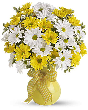 What better gift to send someone than a sunny smile? Think how much that sentiment delivered in the form of this beautiful and cheerful bouquet will mean to whoever’s on your mind today.What could be sweeter than a cheerful yellow vase filled with white and yellow daisies? Can’t think of anything? Then choose this sunny bouquet. It will brighten their day.